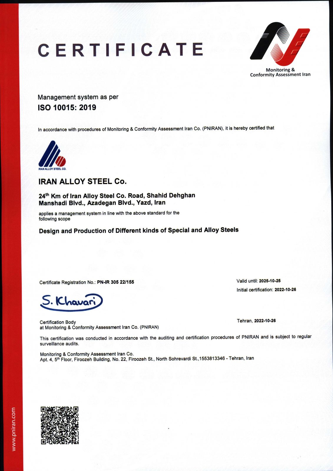 گواهینامه ها - شرکت فولاد آلیاژی ایران(سهامی عام)